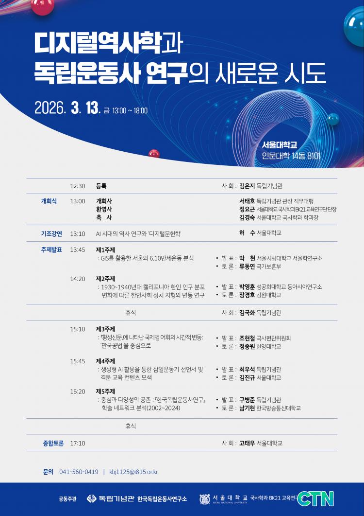 [»çȸ/CTN]°Çö¼ö ±âÀÚ = µ¶¸³±â³ä°ü Çѱ¹µ¶¸³¿îµ¿»ç¿¬±¸¼Ò°¡ ¼¿ï´ëÇб³ ±¹»çÇаú BK21 ±³À°¿¬±¸´Ü°ú ¼ÕÀ» Àâ°í µ¶¸³¿îµ¿»ç ¿¬±¸ÀÇ »õ·Î¿î ÁöÆòÀ» ¿¾ú´Ù. ¾ç ±â°üÀº 13ÀÏ ¼¿ï´ëÇб³ Àι®´ëÇп¡¼ ¡®µðÁöÅпª»çÇаú µ¶¸³¿îµ¿»ç ¿¬±¸ÀÇ »õ·Î¿î ½Ãµµ¡¯¸¦ ÁÖÁ¦·Î °øµ¿ Çмú ½ÉÆ÷Áö¾öÀ» °³ÃÖÇß´Ù.