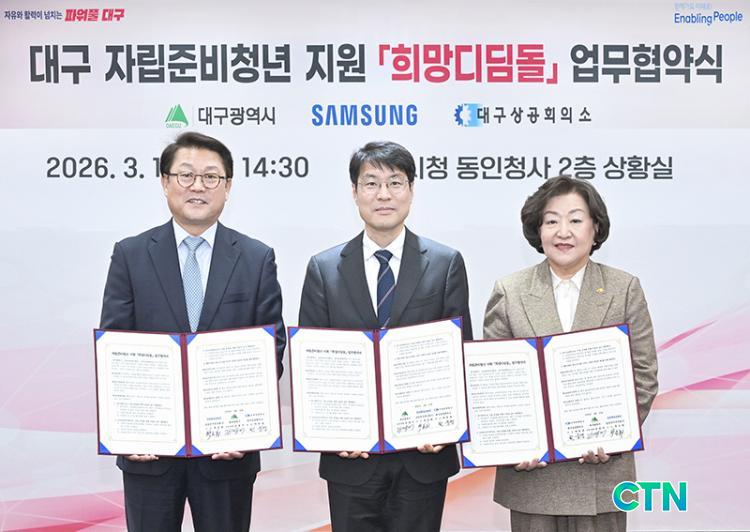 ´ë±¸±¤¿ª½Ã´Â 3¿ù 16ÀÏ ½Ãû µ¿ÀÎû»ç »óȲ½Ç¿¡¼­ »ï¼ºÀüÀÚ, ´ë±¸»ó°øÈ¸ÀÇ¼Ò¿Í ÇÔ²² ÀÚ¸³Áغñû³âÀÇ ¾ÈÁ¤ÀûÀÎ »çȸ Á¤Âø°ú Ãë¾÷ Áö¿ø °­È­¸¦ À§ÇÑ 'Èñ¸Áµðµõµ¹ ¾÷¹«Çù¾à(MOU)'À» ü°áÇß´Ù°í ¹àÇû´Ù. À̳¯ Çù¾à½Ä¿¡´Â ±èÁ¤±â ´ë±¸±¤¿ª½ÃÀå ±ÇÇÑ´ëÇà°ú ¹Ú½ÂÈñ »ï¼ºÀüÀÚ »çÀå, Á¤È¿¸í ºÎ»çÀå, ÇÏÇåÀç »ó¹«, À̰æ¹Î »ï¼º»ý¸í °í¹®, ¹ÚÀ±°æ ´ë±¸»ó°øÈ¸ÀÇ¼Ò È¸Àå µî ÁÖ¿ä ÀÓ¿øÀÌ Âü¼®Çß´Ù.