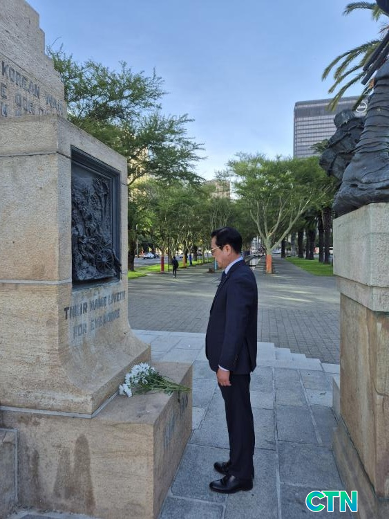 ÀÌ¾î ³²¾ÆÇÁ¸®Ä«°øÈ±¹À¸·Î ÀÚ¸®¸¦ ¿Å±ä ´ëÇ¥´ÜÀº °æÁ¦ °£´ãȸ¶ó´Â º» ÀÏÁ¤¿¡ ¾Õ¼ °¡Àå ¸ÕÀú 6¡¤25ÀüÀï ÂüÀü ±â³äºñ¸¦ ã¾Ò´Ù. ³²¾Æ°øÀº Çѱ¹ÀüÀï ´ç½Ã °ø±º ºÎ´ë¸¦ ÆÄ°ßÇØ ´ëÇѹα¹ÀÇ ÀÚÀ¯ ¼öÈ£¸¦ µµ¿î ÀüÅëÀûÀÎ Ç÷¸Í±¹ÀÌ´Ù. ±è ±ÇÇÑ´ëÇà°ú ´ëÇ¥´ÜÀº ÇåÈ¿Í ¹¬³äÀ» ÅëÇØ ¸Ó³ª¸Õ Ÿ±¹ ¶¥¿¡¼ ½º·¯Á®°£ ¿µ¿õµéÀÇ ³ÌÀ» ±â¸®¸ç °¨»çÀÇ ¸¶À½À» Ç¥Çß´Ù.