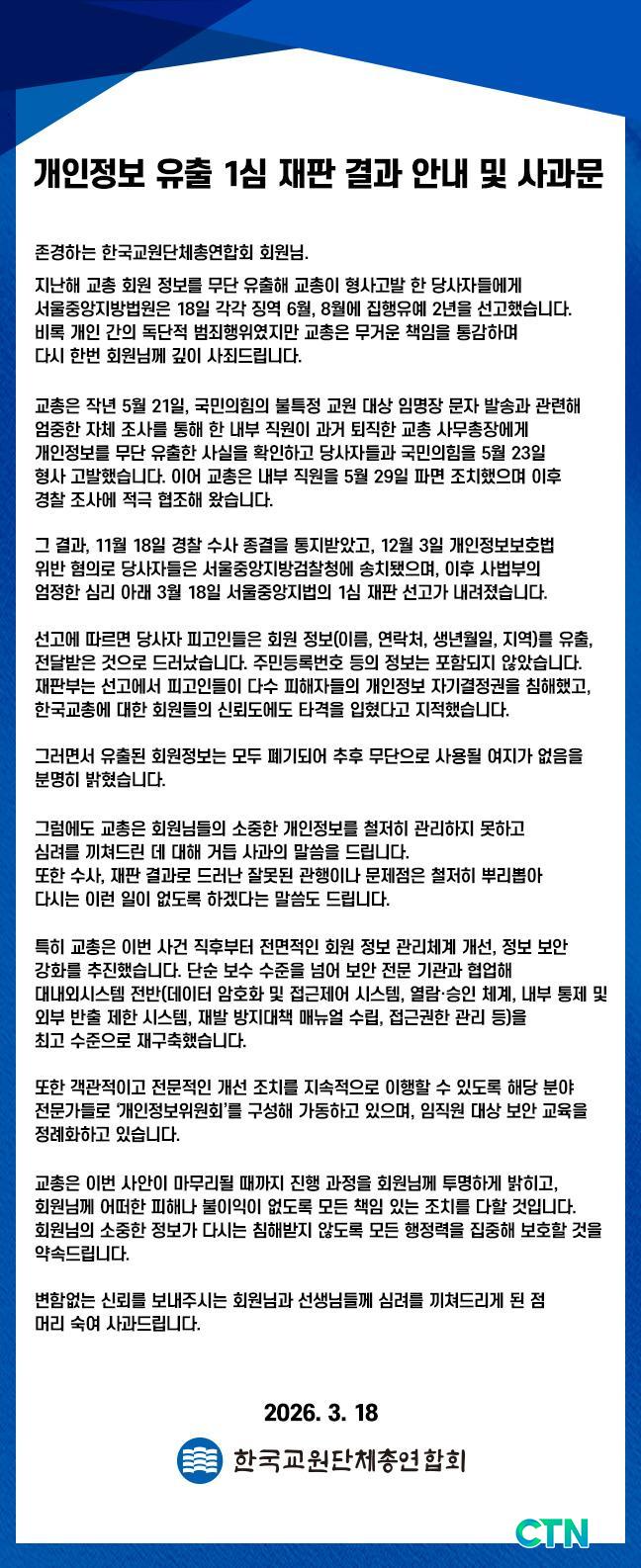 [±³À°/CTN]°¡±ÝÇö ±âÀÚ= Çѱ¹±³¿ø´ÜüÃÑ¿¬ÇÕȸ(ȸÀå Á÷¹«´ëÇà, ÀÌÇÏ ±³ÃÑ)°¡ °ú°Å ¹ß»ýÇÑ È¸¿ø °³ÀÎÁ¤º¸ ¹«´Ü À¯Ãâ »ç°ÇÀÇ 1½É ÀçÆÇ °á°ú¿Í °ü·ÃÇØ ȸ¿øµé¿¡°Ô °ø½Ä »ç°úÇϰí öÀúÇÑ Àç¹ß ¹æÁö¸¦ ¾à¼ÓÇß´Ù.