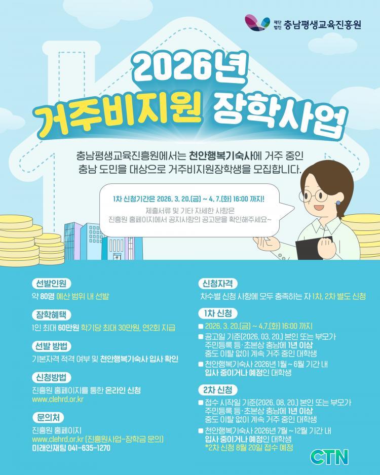 ±âÁ¸¿¡´Â º»ÀÎÀÌ Ãæ³²¿¡ 1³â ÀÌ»ó °è¼Ó °ÅÁÖÇϴ õ¾ÈÇູ±â¼÷»ç¿¡ ÀÔ»ç ÁßÀÎ ´ëÇлý¸¸ Áö¿øÇßÀ¸³ª, ¿ÃÇØ´Â º»ÀÎ ¶Ç´Â ºÎ¸ð°¡ Ãæ³²¿¡ 1³â ÀÌ»ó °è¼Ó °ÅÁÖÇÑ °æ¿ì±îÁö ´ë»óÀÌ È®´ëµÆ´Ù.