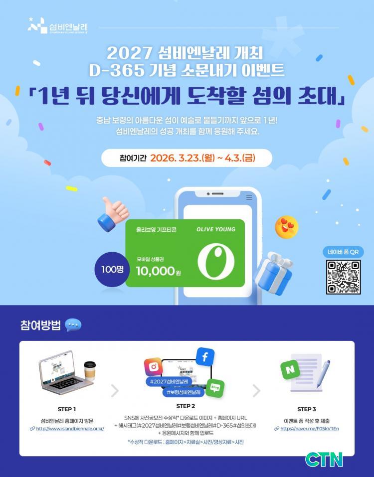 Çà»ç °³ÃÖ 1³â¿©¸¦ ¾ÕµÎ°í Àü±¹Àû ÀÎÁöµµ È®º¸¿Í ÀáÀç °ü¶÷°´ ¸ðÁýÀ» À§ÇØ ¸¶·ÃµÈ À̹ø À̺¥Æ®´Â °ø½Ä ´©¸®Áý(www.islandbiennale.or.kr) ÀÚ·á½Ç ³» '»çÁø°ø¸ðÀü ¼ö»óÀÛ' À̹ÌÁö¸¦ ÀÀ¿ø ¸Þ½ÃÁö¿Í ÇÔ²² °³ÀÎ SNS¿¡ °Ô½ÃÇÏ´Â ¹æ½ÄÀ¸·Î ÁøÇàµÈ´Ù. ÀÌÈÄ Ãß÷À» ÅëÇØ 100¸í¿¡°Ô 1¸¸ ¿ø »ó´çÀÇ ¸ð¹ÙÀÏ ±âÇÁƼÄÜÀ» Áö±ÞÇÒ ¿¹Á¤ÀÌ´Ù.
