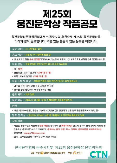 Çѱ¹¹®ÀÎÇùȸ °øÁÖÁöºÎ 'Á¦25ȸ ¿õÁø¹®Çлó ¿î¿µÀ§¿øÈ¸'´Â °øÁÖ½ÃÀÇ ÈÄ¿øÀ¸·Î ´ëÇѹα¹ ¹®Çа踦 À̲ø¾î°¥ Âü½ÅÇÏ°í ¼öÁØ ³ôÀº ÀÛǰÀ» °ø¸ðÇÑ´Ù°í ¹àÇû´Ù.