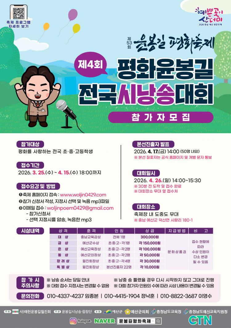 ÆòÈÀ±ºÀ±æ Àü±¹ ½Ã³¶¼Û ´ëȸ´Â °°Àº ³¯ÀÎ 4¿ù 26ÀÏ µµÁßµµ ³» ¹«´ë¿¡¼ °³ÃֵǸç Àü±¹ÀÇ ÃÊ¡¤Áß¡¤°íµîÇлýÀ» ´ë»óÀ¸·Î ÁøÇàµÇ¸ç, À±ºÀ±æ Àǻ簡 »ýÀü¿¡ ³²±ä 12ÆíÀÇ ½Ã Áß¿¡¼ ÁöÁ¤ ½Ã¸¦ ¾Ï¼ÛÇÑ ÆÄÀϰú Âü°¡½Åû¼¸¦ 4¿ù 15ÀϱîÁö À̸ÞÀÏ·Î Á¦ÃâÇϸé Á¢¼öÇÒ ¼ö ÀÖ´Ù.