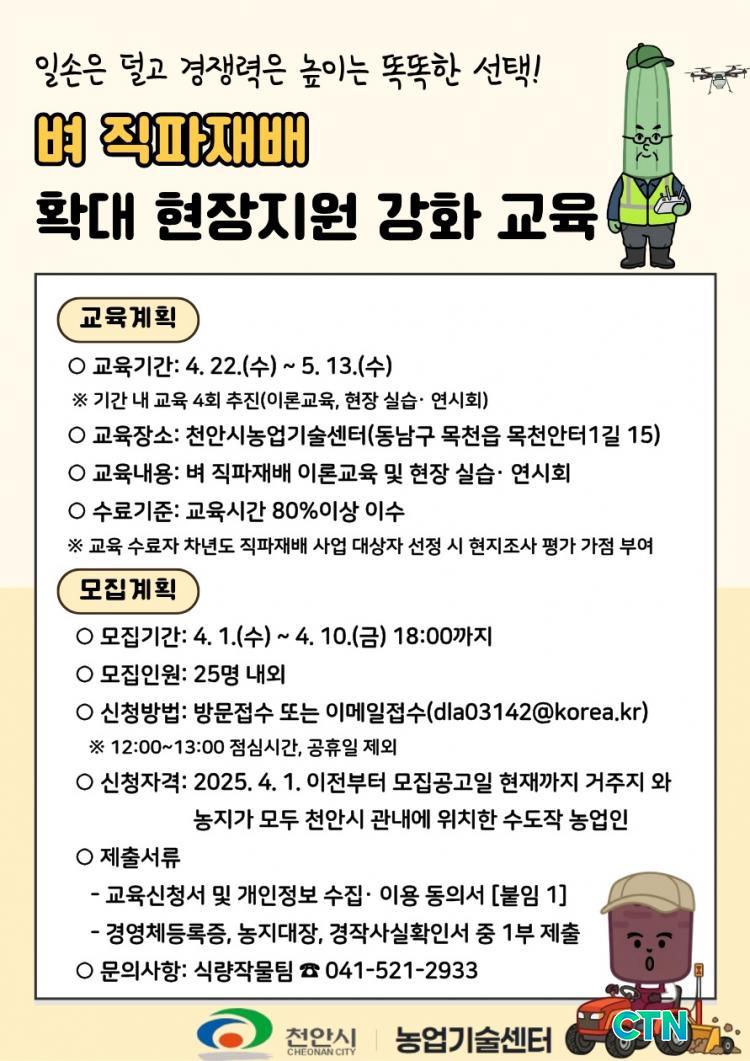 ±³À° °úÁ¤Àº ¿À´Â 22ÀϺÎÅÍ ³»´Þ 13ÀϱîÁö ÃÑ 4ȸ¿¡ °ÉÃÄ ³»½Ç ÀÖ°Ô ¿î¿µµÈ´Ù. ½Åû ´ë»óÀº 2025³â 4¿ù 1ÀÏ ÀÌÀüºÎÅÍ Ãµ¾È½Ã¿¡ °ÅÁÖÇÏ¸ç °ü³» ³óÁö¸¦ º¸À¯ÇÑ ¼öµµÀÛ ³ó¾÷ÀÎÀÌ´Ù. Âü¿©¸¦ Èñ¸ÁÇÏ´Â ³ó°¡´Â õ¾È½Ã³ó¾÷±â¼ú¼¾ÅÍ¿¡ Á÷Á¢ ¹æ¹®Çϰųª ÀüÀÚ¿ìÆíÀ» ÅëÇØ Á¢¼öÇÒ ¼ö ÀÖÀ¸¸ç, ÀÚ¼¼ÇÑ »çÇ×Àº ¼¾ÅÍ ½Ä·®ÀÛ¹°ÆÀÀ¸·Î ¹®ÀÇÇÏ¸é µÈ´Ù.
