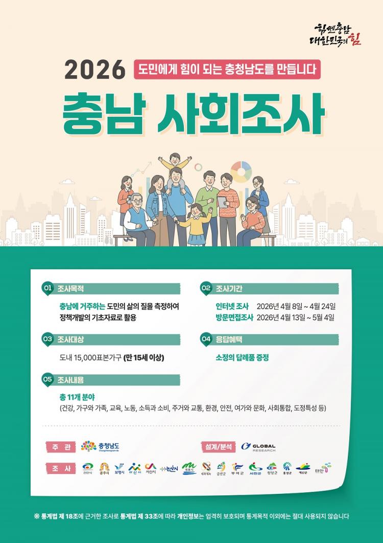 À̹ø Á¶»ç °á°ú´Â ºÐ¼®À» °ÅÃÄ ¿À´Â 12¿ù¿¡ ÃÖÁ¾ °øÇ¥µÇ¸ç, ÇâÈÄ '2026³â ÃæÃ»³²µµ »çȸÁöÇ¥ º¸°í¼'·Î ¹ß°£µÅ °¢Á¾ Áö¿ª ¹ßÀü Á¤Ã¥ ¼ö¸³ÀÇ ÇÙ½É µ¥ÀÌÅͷΠȰ¿ëµÉ ¿¹Á¤ÀÌ´Ù. ±ºÀº Á¶»ç ±â°£ µ¿¾È ´©¸®Áý°ú °ø½Ä SNS µî ¿Â¶óÀΠä³ÎÀ» Ãѵ¿¿øÇØ ÁֹεéÀÇ ÀÚ¹ßÀûÀÎ Âü¿©¸¦ µ¶·ÁÇÒ °èȹÀÌ´Ù.
