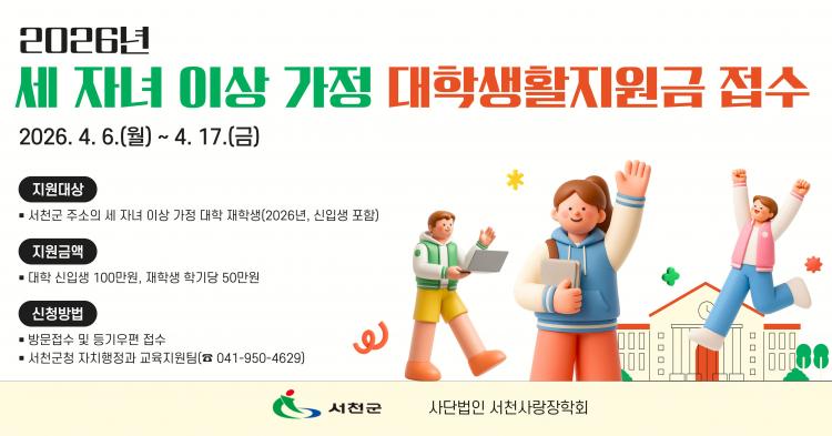 (»ç)¼Ãµ»ç¶ûÀåÇÐȸ´Â '2026³âµµ »ó¹Ý±â ¼¼ ÀÚ³à ÀÌ»ó °¡Á¤ ´ëÇлýȰÁö¿ø±Ý Áö¿ø°èȹ'À» °ø°íÇϰí, ¿À´Â 4¿ù 6ÀϺÎÅÍ 17ÀϱîÁö 2ÁÖ°£ Áö¿ø ½ÅûÀ» ¹Þ´Â´Ù.