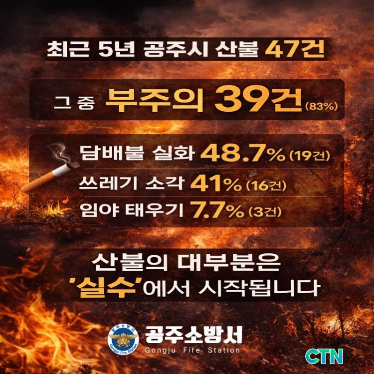 ÃÖ±Ù 5³â°£(2020~2025³â) °øÁֽÿ¡¼ ¹ß»ýÇÑ »êºÒÀº ÃÑ 47°ÇÀ¸·Î, ÀÌ Áß ºÎÁÖÀÇ·Î ÀÎÇÑ ÈÀç°¡ 39°ÇÀ» Â÷ÁöÇÏ´Â °ÍÀ¸·Î ³ªÅ¸³µ´Ù. ¼¼ºÎ ¿øÀÎÀ¸·Î´Â ´ã¹èºÒ ½ÇȰ¡ 48.7%(19°Ç)·Î °¡Àå ³ô¾ÒÀ¸¸ç, ÀÌ¾î ¾²·¹±â ¼Ò°¢ 41%(16°Ç), ÀÓ¾ß Å¿ì±â 7.7%(3°Ç) ¼øÀ¸·Î Áý°èµÆ´Ù. ÀÌ´Â ÀÏ»ó ¼Ó »ç¼ÒÇÑ ºÎÁÖÀǰ¡ »êºÒ ¹ß»ýÀÇ ÁÖ¿ä ¿øÀÎÀÓÀ» º¸¿©ÁØ´Ù.