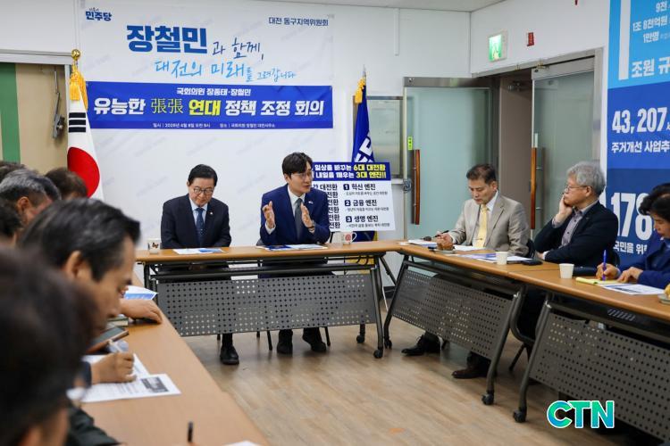 [´ëÀü/CTN]Á¤¹ÎÁØ ±âÀÚ¤Ó´õºÒ¾î¹ÎÁÖ´ç Àåö¹Î ´ëÀü½ÃÀå °æ¼± °á¼± Èĺ¸¿Í ÀåÁ¾Å ±¹È¸ÀÇ¿ø(´ëÀü ¼±¸°©)ÀÌ 8ÀÏ Á¤Ã¥´Ü ¿¬¼®È¸ÀǸ¦ ¿°í ¡®ÀåÀ忬´ë¡¯ÀÇ ÈÇÐÀû À¶ÇÕÀ» ¾Ë¸®´Â °·ÂÇÑ Á¤Ã¥ °øÁ¶¸¦ ¼±¾ðÇß´Ù. ¾çÃøÀº À̹ø ȸÀǸ¦ ÅëÇØ ÀåÁ¾Å ÀÇ¿øÀÇ ÇÙ½É Á¤Ã¥ÀÎ ¡®AI º¹Áö ´ëÀüȯ¡¯°ú ¼±¸°© Áö¿ªÀÇ ÁßÁ¡ ¼÷¿ø»ç¾÷µéÀ» Àåö¹Î Èĺ¸ÀÇ ÇÙ½É ½ÃÁ¤ °ø¾àÀ¸·Î »ï¾Æ Àû±Ø ÃßÁøÇϱâ·Î ¶æÀ» ¸ð¾Ò´Ù. À̳¯ ȸÀÇ¿¡´Â Àåö¹Î Èĺ¸¿Í ÀåÁ¾Å ÀÇ¿ø°ú ´õºÒ¾î °¢ Ä·ÇÁÀÇ ÇÙ½É Á¤Ã¥´Ü 5¸í¾¿ÀÌ Âü¼®Çß´Ù.