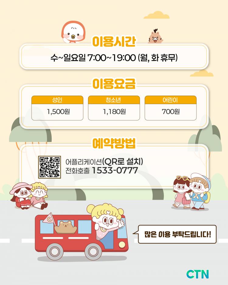 ¿îÇà½Ã°£Àº ¿ÀÀü 7½ÃºÎÅÍ ¿ÀÈÄ 7½Ã±îÁöÀ̸ç, ¼ºÀÎ ±âÁØ 1,500¿øÀÇ ½Ã³»¹ö½º ¼öÁØ ¿ä±ÝÀ¸·Î ÀÌ¿ëÇÒ ¼ö ÀÖ¾î ºÎ´ãµµ Å©Áö ¾Ê´Ù.