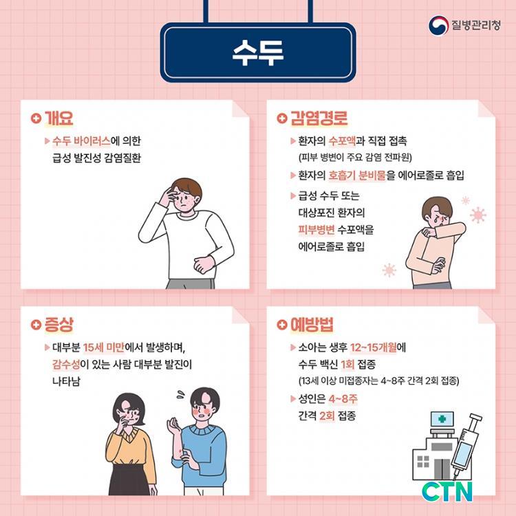 ¼öµÎ´Â ¼öµÎ-´ë»óÆ÷Áø ¹ÙÀÌ·¯½º¿¡ ÀÇÇØ ¹ß»ýÇϸç, °¨¿°ÀÚÀÇ ±âħ¡¤Àçä±â µî È£Èí±â ºÐºñ¹°°ú ¼öÆ÷¼º º´º¯°úÀÇ Á÷Á¢ Á¢ÃËÀ» ÅëÇØ ÀüÆÄµÈ´Ù. Ãʱ⿡´Â ¹Ì¿°ú Àü½Å ±ÇۨÀÌ ³ªÅ¸³ª°í ÀÌÈÄ ¸ö Àüü¿¡ ºÓÀº ¹ßÁø°ú ¼öÆ÷°¡ »ý±â¸ç ½ÉÇÑ °¡·Á¿òÁõÀ» µ¿¹ÝÇÑ´Ù. Áõ»óÀÌ °¡º±´õ¶óµµ ÀüÆÄ·ÂÀÌ °Çϱ⠶§¹®¿¡ Áý´Ü½Ã¼³ ³»¿¡¼´Â ÇÑ ¸íÀÇ °¨¿°ÀÚ·Î ÀÎÇØ ´Ù¼öÀÇ Ãß°¡ °¨¿°ÀÌ ¹ß»ýÇÒ ¼ö ÀÖ´Ù.