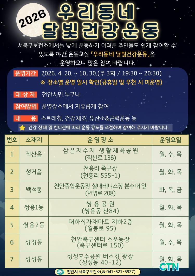 [õ¾È/CTN] °Çö¼ö ±âÀÚ = õ¾È½Ã°¡ ³· ½Ã°£´ë ¿îµ¿ÀÌ ¾î·Á¿î ½Ã¹ÎµéÀÇ °Ç° ÁõÁøÀ» À§ÇØ ¿À´Â 20ÀϺÎÅÍ 10¿ù 30ÀϱîÁö °ü³» ÁÖ¿ä °ø¿ø 14°³¼Ò¿¡¼ ¡®¿ì¸®µ¿³× ´Þºû°Ç°¿îµ¿¡¯À» º»°Ý ¿î¿µÇÑ´Ù. Áö³ÇØ¿¡¸¸ 6¸¸ 1,000¿© ¸íÀÇ ½Ã¹ÎÀÌ Âü¿©ÇÏ¸ç ¶ß°Å¿î È£ÀÀÀ» ¾ò¾ú´ø ÀÌ ÇÁ·Î±×·¥Àº ¾ß°£ ½Ã°£À» Ȱ¿ëÇÑ Ãµ¾È½ÃÀÇ ´ëÇ¥ÀûÀÎ »ýȰüÀ° »ç¾÷ÀÌ´Ù.