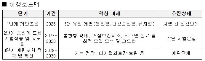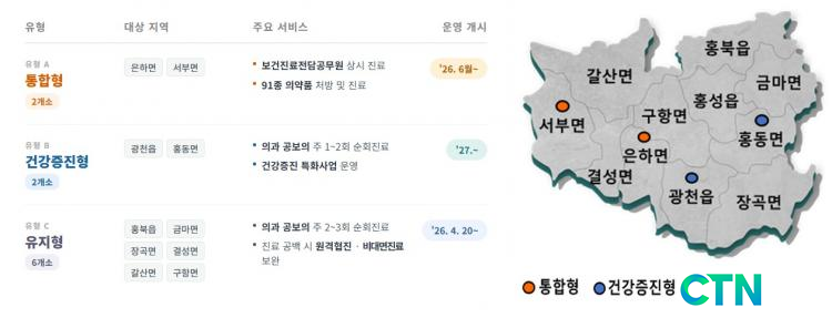 ±ºÀº 2026³â 6¿ùºÎÅÍ ¡ãÀºÇϸé, ¼ºÎ¸é 2°³ Áö¼Ò¸¦ ´ë»óÀ¸·Î º¸°ÇÁø·áÀü´ã°ø¹«¿øÀÌ 91Á¾ÀÇ ÀǾàǰ 󹿡¤Áø·á¸¦ »ó½Ã Á¦°øÇÏ´Â 'ÅëÇÕÇü' ¡ã¹Î°£ÀÇ·á±â°üÀÌ À§Ä¡ÇÑ ±¤ÃµÀ¾, È«µ¿¸é 2°³ Áö¼Ò·Î, Áø·á ±â´ÉÀº Àǰú °øº¸ÀÇ ¼øÈ¸Áø·á¸¦ ÁÖ1~2ȸ·Î ÃÖ¼ÒÈÇϸç, Áö¿ª Ư¼º¿¡ ¸Â°Ô ÃßÁøÇÏ´Â '°Ç°ÁõÁøÇü' ¡ãÈ«ºÏÀ¾, ±Ý¸¶¸é, Àå°î¸é, °á¼º¸é, °¥»ê¸é, ±¸Ç׸é 6°³ Áö¼Ò·Î Àǰú °øº¸ÀÇ ¼øÈ¸Áø·á¸¦ ÁÖ2~3ȸ ÁøÇàÇÏ´Â ±âÁ¸ÀÇ 'À¯ÁöÇü'À¸·Î ÃÑ 3°¡Áö ¹æ½ÄÀ¸·Î ÃßÁøÇÑ´Ù.