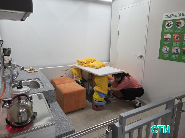 ÁöÁøÃ¼Çè¿¡ Âü¿©ÇÑ ¾î¸°À̵éÀÌ Å¹ÀÚ ¾Æ·¡·Î ¸öÀ» ¼û±â¸ç ÁöÁø ¹ß»ý ½Ã Çൿ¿ä·ÉÀ» ÀÍÈ÷°í ÀÖ´Ù.