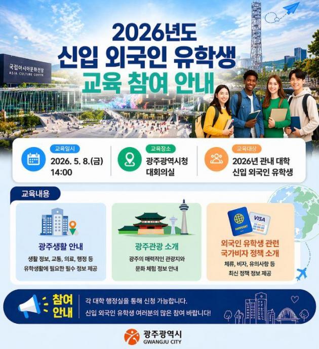 ±¤ÁÖ±¤¿ª½Ã´Â ¿À´Â 5¿ù 8ÀÏ ¿ÀÈÄ 2½Ã ½Ãû ´ëȸÀǽǿ¡¼ Áö¿ª ´ëÇÐ ½ÅÀÔ À¯ÇлýµéÀ» ´ë»óÀ¸·Î '2026³â ½ÅÀÔ ¿Ü±¹ÀÎ À¯Çлý Á¾ÇÕ ¿À¸®¿£Å×À̼Ç'À» ½Ç½ÃÇÑ´Ù. 2024³â ½ÃÀÛÇØ ¿ÃÇØ·Î 3ȸ°¸¦ ¸Â´Â À̹ø ±³À°Àº 6,600¿© ¸í¿¡ ´ÞÇÏ´Â À¯ÇлýµéÀÌ ³¸¼± Çѱ¹ »ýȰ¿¡ Á¶±â ÀûÀÀÇϵµ·Ï µ½±â À§ÇØ ¸¶·ÃµÆ´Ù.