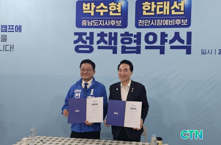[Á¤Ä¡/CTN]°Çö¼ö ±âÀÚ = ´õºÒ¾î¹ÎÁÖ´çÀÇ ÇÑż± õ¾È½ÃÀå ¿¹ºñÈĺ¸¿Í ¹Ú¼öÇö Ãæ³²µµÁö»ç È帰¡ õ¾ÈÀÇ Áöµµ¸¦ ¹Ù²Ü ´ë±Ô¸ð Á¤Ã¥ ¿¬´ë¸¦ ¼±¾ðÇÏ¸ç ¼±°Å ±¹¸éÀÇ ½Â±â¸¦ Àâ±â À§ÇÑ ±¤Æø Çຸ¿¡ ³ª¼¹´Ù. µÎ È帴 Áö³ 16ÀÏ ÇÑż± ¿¹ºñÈĺ¸ÀÇ ¼±°ÅÄ·ÇÁ¿¡¼ Á¤Ã¥Çù¾à½ÄÀ» °®°í õ¾ÈÀÇ 100³â ¸Ô°Å¸®¸¦ Ã¥ÀÓÁú 6´ë ÇÙ½É Á¤Ã¥ ÃßÁø¿¡ Àü°Ý ÇÕÀÇÇß´Ù.