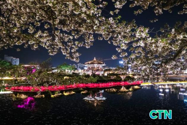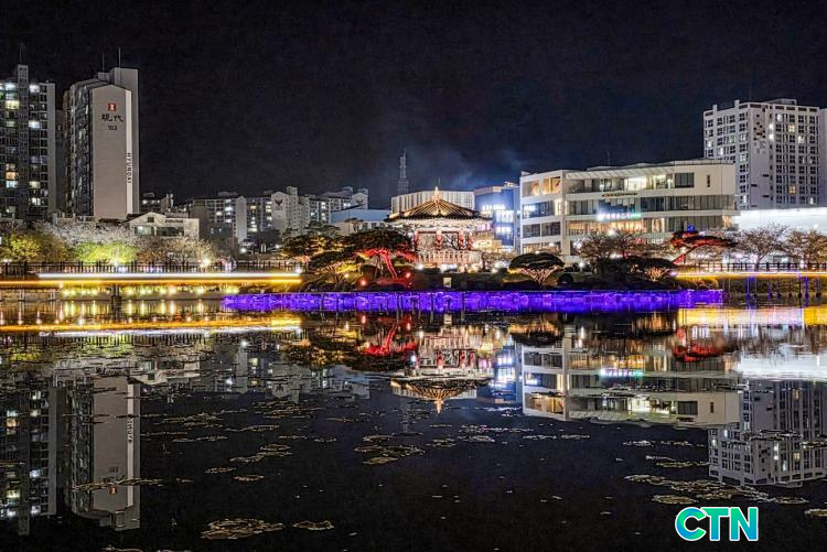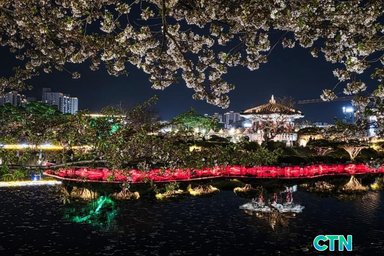 Áö³ 13ÀÏ ¹ã, ¼»êÁß¾ÓÈ£¼ö°ø¿øÀº ¸¸°³ÇÑ º¢²É°ú È·ÁÇÑ °æ°ü Á¶¸íÀÌ ¾î¿ì·¯Á® ÀýÁ¤ÀÇ ¾ß°æÀ» ¼±»çÇß´Ù. È£¼ö Áß¾ÓÀÇ '¼È£Á¤'À» Áß½ÉÀ¸·Î ÆîÃÄÁø Á¶¸íÀº ¼ö¸é À§·Î ÇüÇü»ö»öÀÇ ºûÀ» Åõ¿µÇÏ¸ç ½Ã¹ÎµéÀÇ °¨ÅºÀ» ÀھƳ´Ù. ƯÈ÷ ¹ãÇÏ´ÃÀ» ¼ö³õÀº ÇÏ¾á º¢²É ¼ÛÀ̵éÀÌ ÀºÀºÇÑ Á¶¸íÀ» ¹Þ¾Æ ¸¶Ä¡ º¸¼®Ã³·³ ºû³ª´Â ¸ð½ÀÀº °ø¿øÀ» ãÀº À̵鿡°Ô ÀØÁö ¸øÇÒ º½¹ãÀÇ Ãß¾ïÀ» ¼±¹°Çß´Ù.