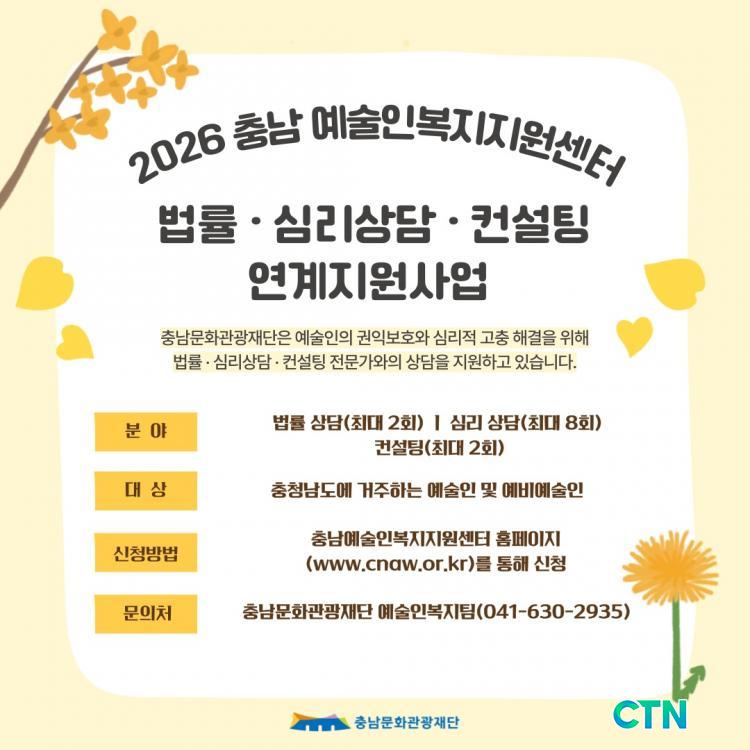 [Ãæ³²/CTN]ÇѼºÁø ±âÀÚ = Ãæ³²¹®È°ü±¤Àç´Ü(´ëÇ¥ÀÌ»ç À̱âÁø)ÀÌ ¿¹¼úÀÎÀÇ ±ÇÀÍ º¸È£¿Í âÀÛȯ°æ °³¼±À» À§ÇÑ '2026 ¹ý·ü¡¤½É¸®»ó´ã ¹× ÄÁ¼³ÆÃ ¿¬°èÁö¿ø»ç¾÷'À» 4¿ùºÎÅÍ º»°Ý ÃßÁøÇÑ´Ù. À̹ø »ç¾÷Àº ¿¹¼úÀÎÀÌ ÇöÀå¿¡¼ °Þ´Â ´Ù¾çÇÑ ¹®Á¦ ÇØ°áÀ» À§ÇØ ¹ý·ü¡¤½É¸®¡¤¿¹¼úȰµ¿ ºÐ¾ß Àü¹®°¡¿ÍÀÇ »ó´ãÀ» ¿¬°èÇØ Áö¿øÇÏ´Â °ÍÀÌ ÇÙ½ÉÀÌ´Ù.