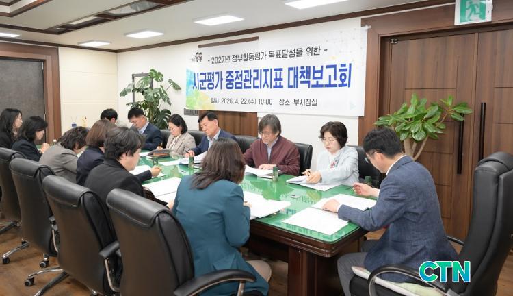 [³í»ê/CTN]Á¤Áöö ±âÀÚ = ³í»ê½Ã´Â 22ÀÏ ºÎ½ÃÀå½Ç¿¡¼ '2027³â Á¤ºÎÇÕµ¿Æò°¡ ¸ñÇ¥´Þ¼ºÀ» À§ÇÑ ½Ã¡¤±ºÆò°¡ ÁßÁ¡°ü¸®ÁöÇ¥ ´ëÃ¥ º¸°íȸ'¸¦ °³ÃÖÇß´Ù.