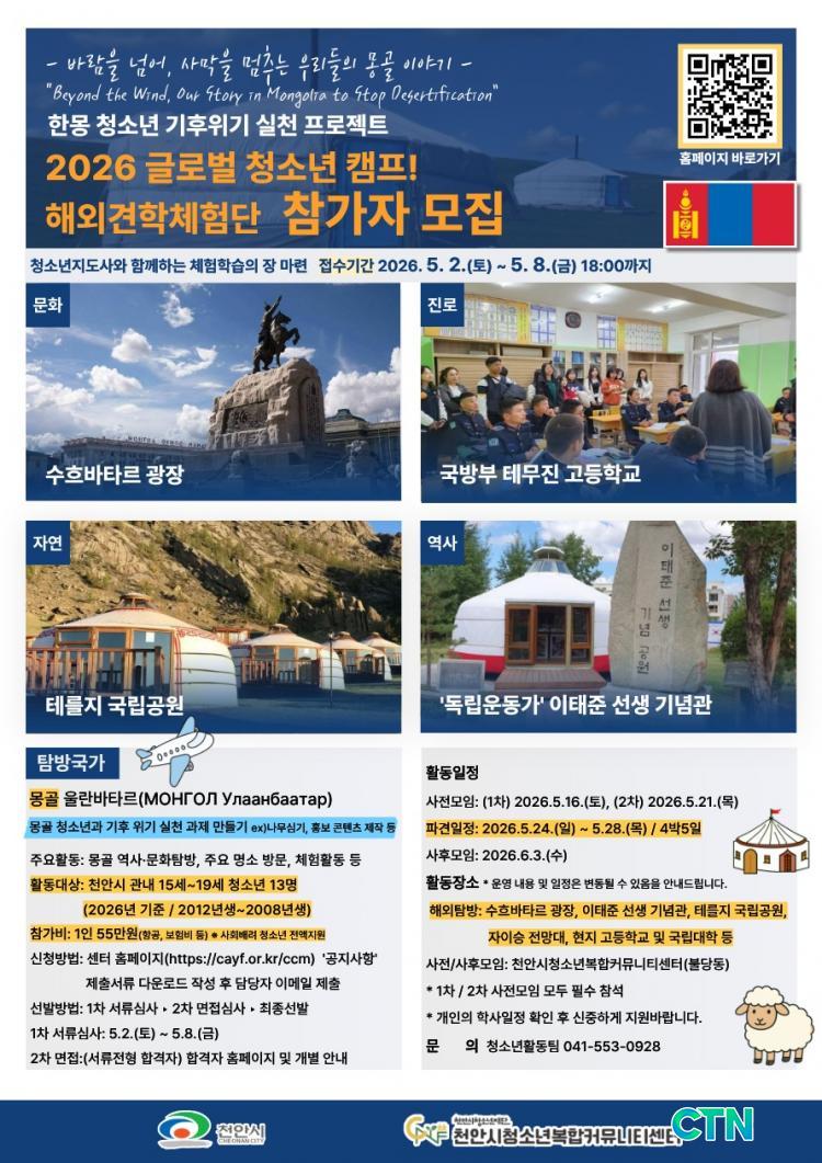 [õ¾È/CTN]°Çö¼ö ±âÀÚ = õ¾ÈÀÇ Ã»¼Ò³âµéÀÌ ±âÈÄ À§±â¶ó´Â Àηù °øÅëÀÇ °úÁ¦¸¦ ÇØ°áÇϱâ À§ÇØ ¸ù°ñÀÇ ±¤È°ÇÑ ÃÊ¿ø°ú »ç¸·À¸·Î ÇâÇÑ´Ù. õ¾È½Ãû¼Ò³âÀç´Ü »êÇÏ Ãµ¾È½Ãû¼Ò³âº¹ÇÕÄ¿¹Â´ÏƼ¼¾Åʹ û¼Ò³âµéÀÇ ±Û·Î¹ú ¿ª·®À» °ÈÇϰí Áö±¸ÃÌ »ýÅ ¹®Á¦¿¡ ´ëÇÑ ½ÇõÀû ´ë¾ÈÀ» ¸ð»öÇϱâ À§ÇØ 2026 û¼Ò³â ±¹Á¦±³·ù Ä·ÇÁ ¸ù°ñ ޹æ Âü°¡ÀÚ¸¦ Àü°Ý ¸ðÁýÇÑ´Ù°í 28ÀÏ ¹àÇû´Ù. À̹ø ÇÁ·Î±×·¥Àº ¹Ù¶÷À» ³Ñ¾î »ç¸·À» ¸ØÃß´Â ¿ì¸®µéÀÇ ¸ù°ñ À̾߱⸦ ÁÖÁ¦·Î ´Ü¼øÇÑ °ßÇÐÀ» ³Ñ¾î¼± ±âÈÄ À§±â ½Çõ ÇÁ·ÎÁ§Æ®·Î ±âȹµÆ´Ù.